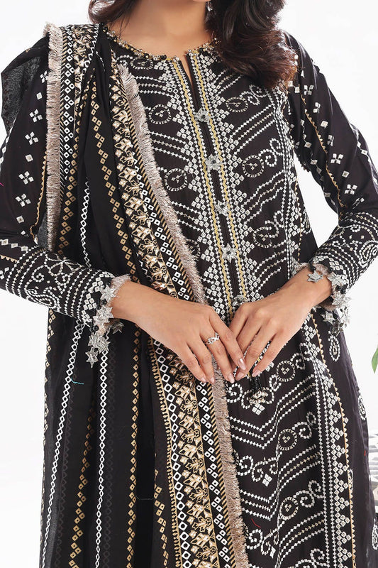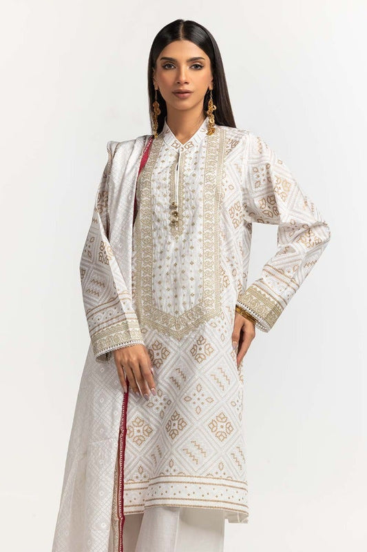 Gul Ahmed 3 Piece Unstitched Zari Embroidered Lawn Suit with Gold Lacquer Printed Lawn Dupatta CL-52407
