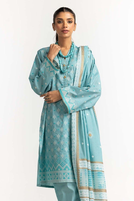 Gul Ahmed 03 Piece Stitched Dyed Chambray Jacquard Shirt Dupatta Chambray Trouser KJP-43189